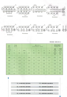 2)現(xiàn)在靜音無聲齒形鏈條應(yīng)用越來越廣泛,高速無聲靜音低噪音鏈條齒輪應(yīng)用越來越普遍,有的人把原來的同步帶都換成這種無聲齒形鏈條,有的人使用滾子鏈條噪音太大,也在改成無聲齒形鏈條齒輪。有的高精密要求傳送傳遞精度高的輸送線也在采用無聲齒形鏈條齒輪,好多鍛造行業(yè)快速的傳送鍛造件也在采用無聲齒形鏈條,在輸送線上有好多需要平穩(wěn)輸送的也在采用無聲齒形鏈條作為輸送帶來輸送物件。目前齒形鏈條有一秒16米到30米,無聲齒形鏈條有單軸的,有雙軸的,節(jié)距有9.525毫米的型號CL06 SC3,12.7毫米的CL08 SC4 C4,15.875毫米的無聲齒形鏈條CL10,SC5 ,19.05毫米的CL12 SC6 ,25.4毫米的CL16,SC6;31.75毫米齒形鏈條CL20 SC10 ,無聲齒形鏈條38.1毫米CL24 .