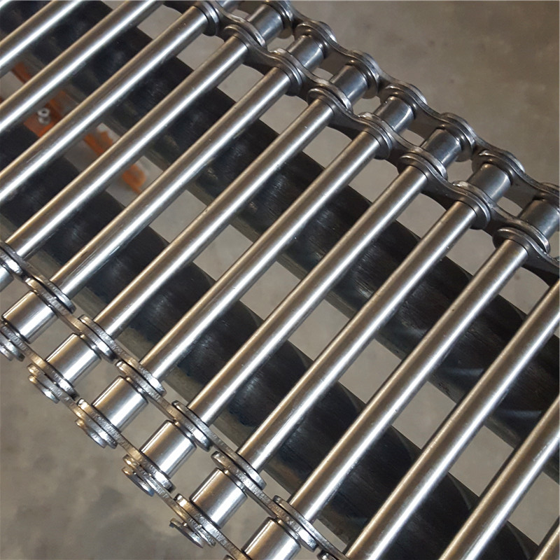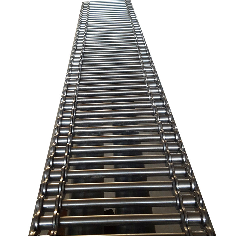 這是一種利用鏈條和支軸做成的傳送輸送帶。先把支軸穿軸的兩頭車細,然后兩邊鑲上鏈條,最后用墊圈把支軸焊上或用開口銷銷上,這就是鏈桿式輸送帶。鏈條的節(jié)距和材質和滾子的大小各種都有,支軸的粗細和材質和直徑和長度有多種型號供選擇。