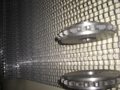 馬蹄鏈又稱長(zhǎng)城網(wǎng),由扁平金屬片和圓金屬絲所組成,網(wǎng)帶自重輕,網(wǎng)孔空隙大,網(wǎng)面平整,運(yùn)行平穩(wěn),不會(huì)走偏??勺飨礈?、干燥、冷卻、熱處理的輸送線。
