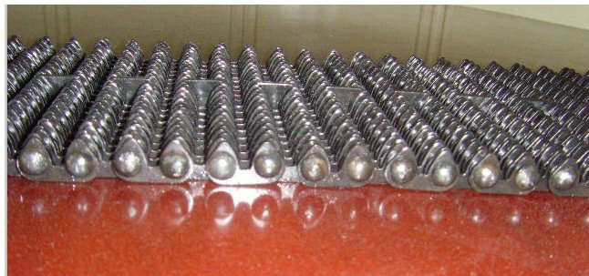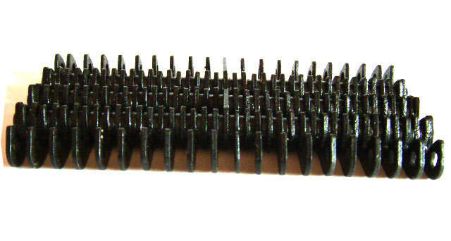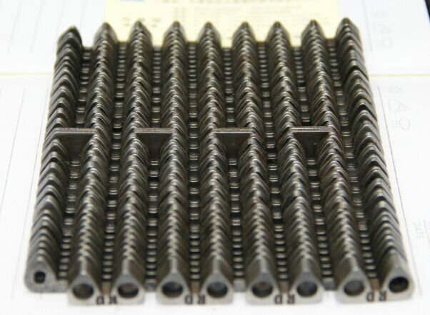 無聲鏈帶:一種玻璃機(jī)械輸瓶機(jī)配件,用在玻璃機(jī)械輸送機(jī)上,在行列式制瓶機(jī),輸瓶機(jī),輸送玻璃杯子的輸送線上用無聲齒型鏈,這種無聲齒形鏈條節(jié)距12.7毫米,內(nèi)導(dǎo)向或者外導(dǎo)向的,無聲齒形鏈條采用特殊熱處理工藝,這種淬火處理熱處理厚度0.2毫米,解決了熱處理硬度不過關(guān)的問題,硬度大了,斷片;熱處理硬度小了不耐磨的問題。