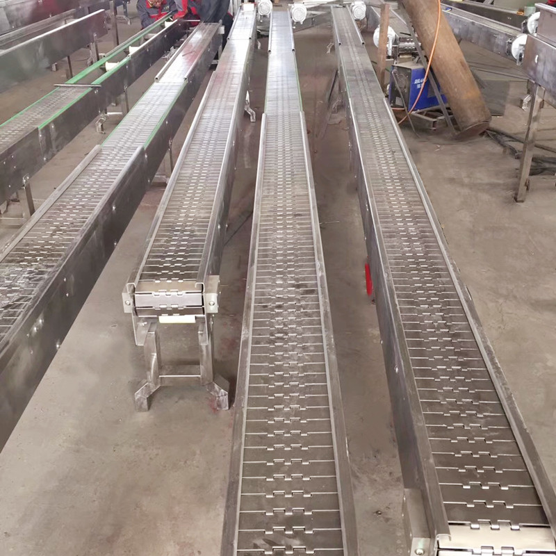 (5)槽鋼扣板輸送機(jī)。采用8個(gè)國(guó)標(biāo)槽鋼制作。輸送大型笨重的鍛造件,平穩(wěn)。使用壽命長(zhǎng)。抗砸,抗沖擊力。槽鋼扣板輸送機(jī)多數(shù)用來(lái)輸送大鍛造件。