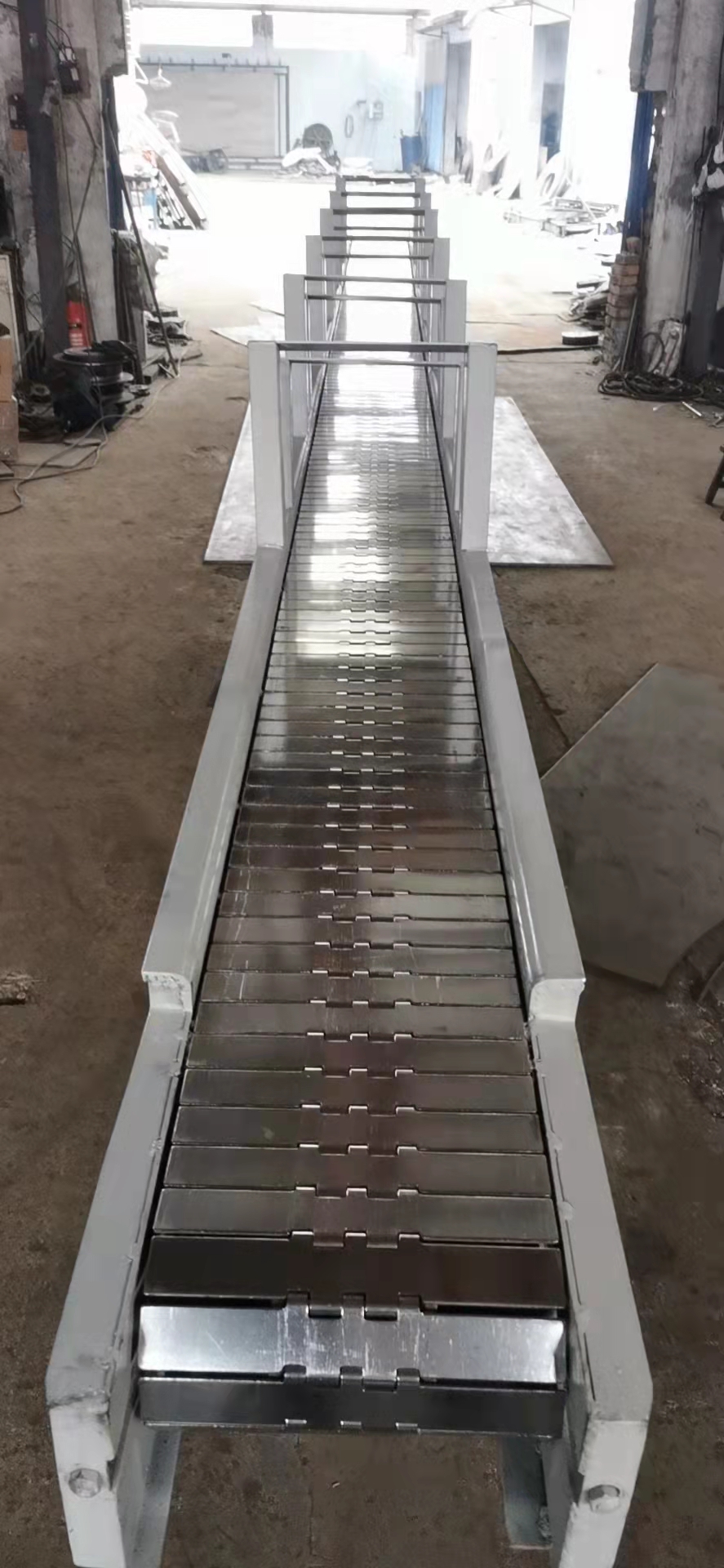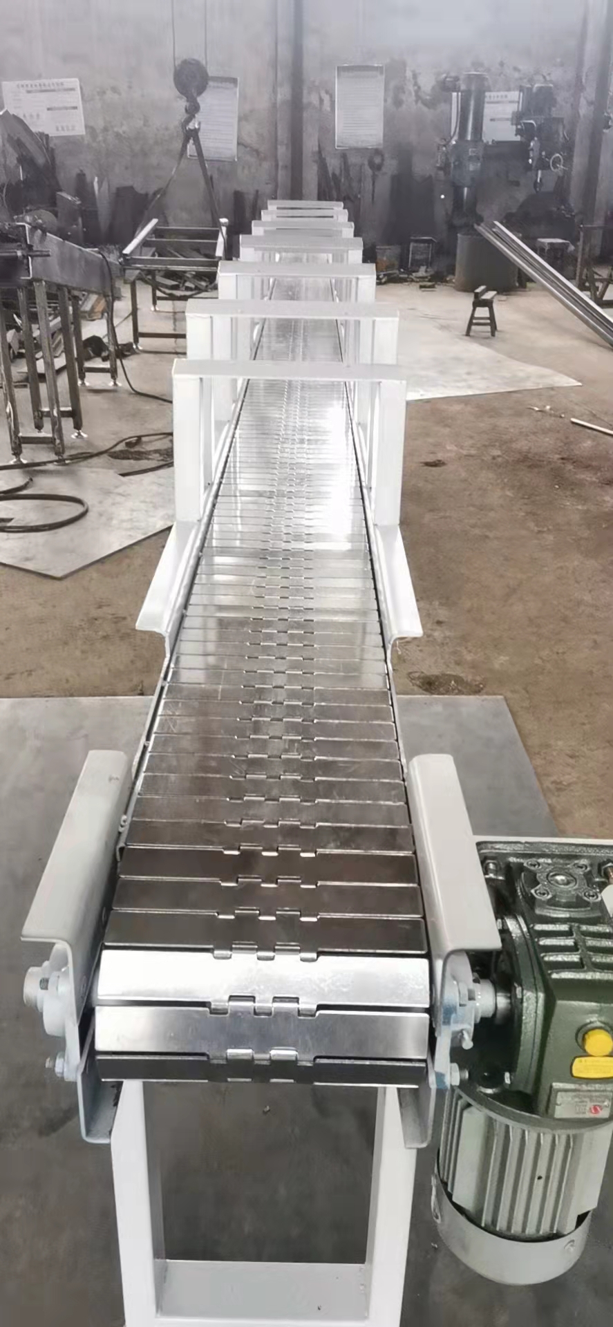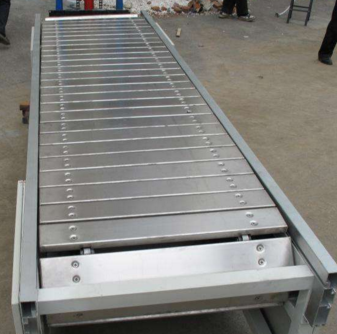 鏈板輸送機(jī):又叫鏈板傳送機(jī)鏈板線,鏈板傳送帶。是一種利用循環(huán)往復(fù)的鏈條作為牽引動力,以金屬板作為輸送承載體的一種輸送機(jī)械設(shè)備。國內(nèi)市場上有兩種鏈板輸送機(jī),一種是用鏈條,支軸和金屬板組成的輸送鏈板做成的輸送機(jī);一種是用帶彎板的鏈條和金屬板組成的金屬板輸送帶做成的鏈板輸送機(jī),另一種是平頂鏈鏈板輸送機(jī)。