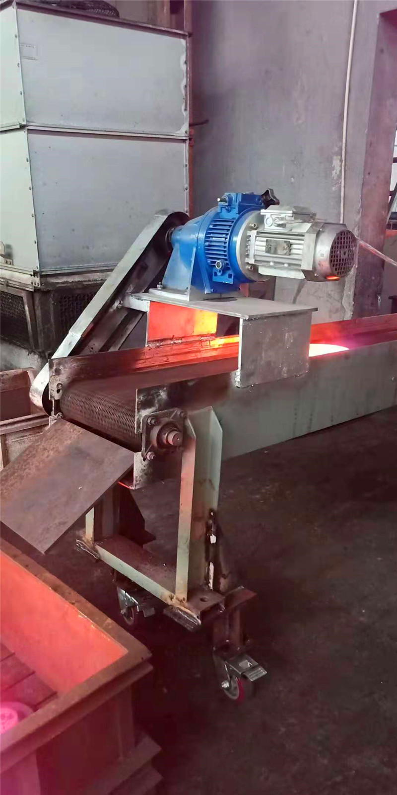無聲齒形鏈帶鍛件用輸送機。用齒形鏈帶輸送帶來輸送鍛件也是可以的,它的優(yōu)點是無聲 噪音小 輸送速度不超過25/分鐘,能夠滿足8-11秒出1只產(chǎn)品的要求。