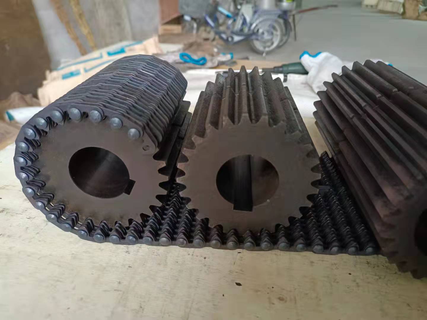 無聲鏈 齒形鏈輪 無聲鏈:也叫齒形鏈條,采用無聲齒形鏈輪帶動(dòng)運(yùn)轉(zhuǎn)傳動(dòng)。寧津縣榮達(dá)機(jī)械制造有限責(zé)任公司定做各種無聲齒形鏈條,無聲齒形鏈輪。我們根據(jù)客戶自己的情況,客戶選型成功,我們根據(jù)客戶的數(shù)據(jù)非標(biāo)定做各種齒形鏈條和無聲齒形鏈輪。齒形鏈條節(jié)距4.7625,6.35 9.525 12.7 15.875 19.05 25.4 31.75 38.1毫米的鏈條都能做,無聲齒形鏈輪根據(jù)客戶的齒數(shù)和外徑,內(nèi)孔,鍵槽定做。無聲齒形鏈條的獨(dú)特優(yōu)點(diǎn):高速,無噪音,高承載傳動(dòng)能力,轉(zhuǎn)矩大等等優(yōu)點(diǎn),逐漸取代精密滾子鏈條和同步帶。