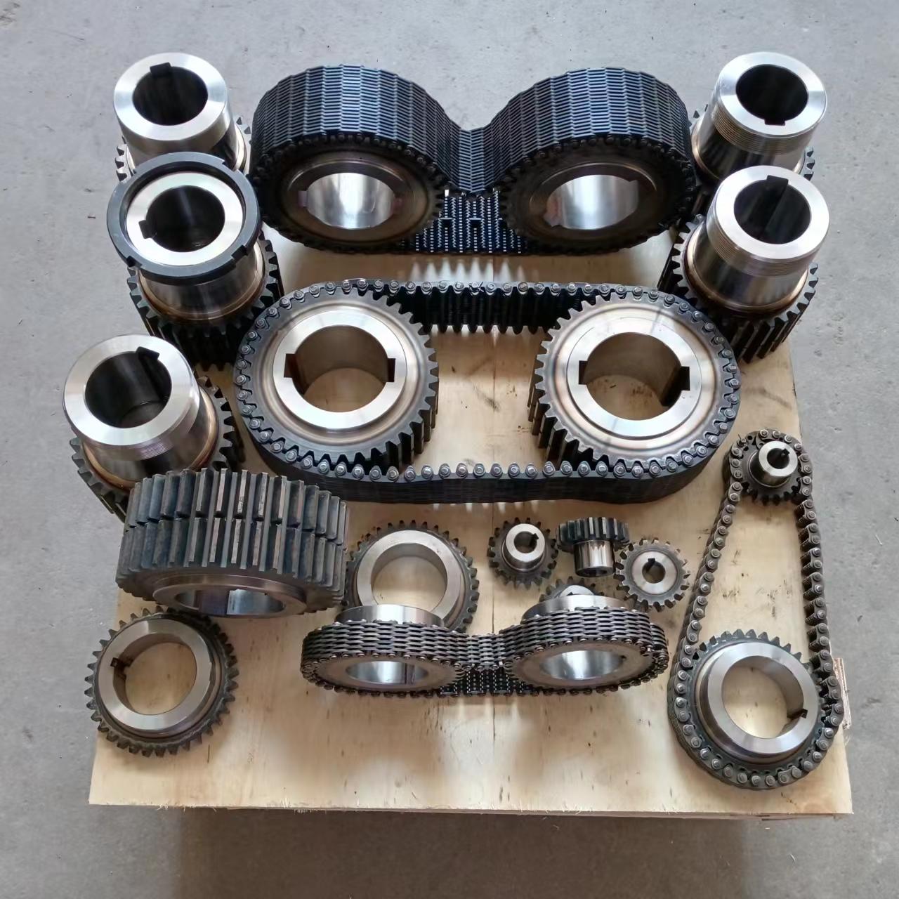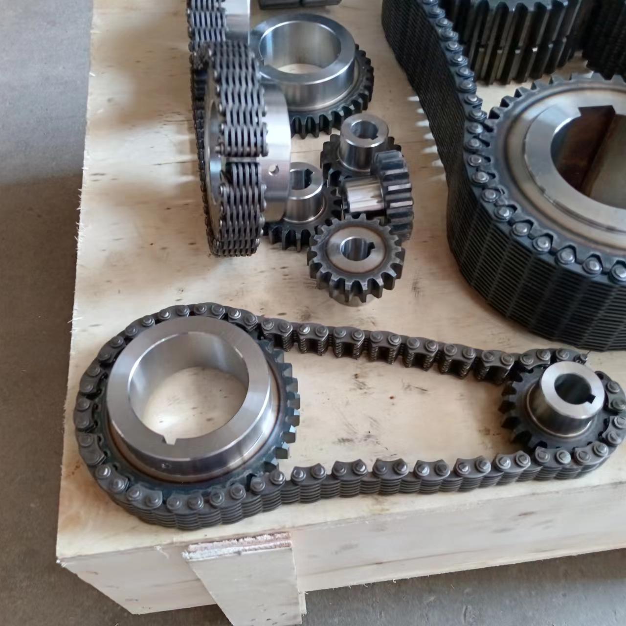 無聲鏈 齒形鏈輪 無聲鏈:也叫齒形鏈條,采用無聲齒形鏈輪帶動運轉(zhuǎn)傳動。寧津縣榮發(fā)齒輪廠定做各種無聲齒形鏈條,無聲齒形鏈輪。我們根據(jù)客戶自己的情況,客戶選型成功,我們根據(jù)客戶的數(shù)據(jù)非標定做各種齒形鏈條和無聲齒形鏈輪。齒形鏈條節(jié)距4.7625,6.35 9.525 12.7 15.875 19.05 25.4 31.75 38.1毫米的鏈條都能做,無聲齒形鏈輪根據(jù)客戶的齒數(shù)和外徑,內(nèi)孔,鍵槽定做。無聲齒形鏈條的獨特優(yōu)點:高速,無噪音,高承載傳動能力,轉(zhuǎn)矩大等等優(yōu)點,逐漸取代精密滾子鏈條和同步帶。