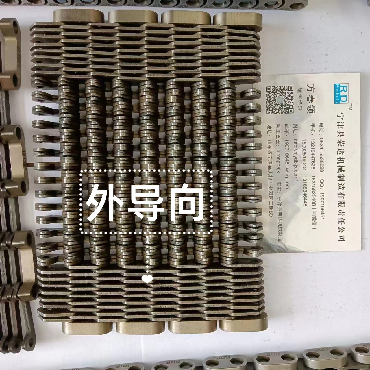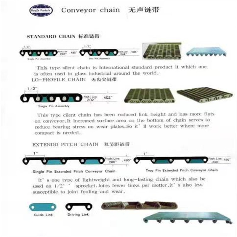 1.無聲齒形鏈帶:一種金屬輸送帶,采用鏈條片和銷軸于墊圈做成的輸送用傳送帶,外形寬度非標定做也有好多規(guī)格的現(xiàn)貨,鏈帶是用在玻璃廠輸送玻璃瓶罐器皿日用玻璃器皿的,也有的時候用在其他的輸送機械上,用來輸送其他產品,無聲齒形鏈帶的優(yōu)點就是平整,輸送面平穩(wěn),輸送高腳杯,不會倒瓶,無聲齒形鏈帶用來輸送高溫玻璃制品,用于玻璃機械行列式制瓶機上,橫向輸瓶機,我們現(xiàn)在還研發(fā)了轉彎的拐彎的無聲齒形鏈帶,用于縱向拐彎橫向結合的輸送機上。無聲齒形鏈帶材質有碳鋼的 錳鋼的 合金鋼的 ,節(jié)距有12.7毫米 25.4毫米 單軸的和雙軸的,無齒形鏈帶從外形看有內導向和外導向,無聲齒形鏈帶有帶保護帽的和不帶保護帽的,無聲齒形鏈帶有帶尖的和不帶尖的。寬度125毫米 150毫米 200毫米 300毫米 常年有現(xiàn)貨 當天下單當天發(fā)貨 配套的無聲齒形鏈輪有現(xiàn)貨 英文名稱Silent tooth chain ,顏色有發(fā)黑的有本色的。常規(guī)的是5米一件 五米一木箱 ,用于輸送機上一般是每分鐘15米左右